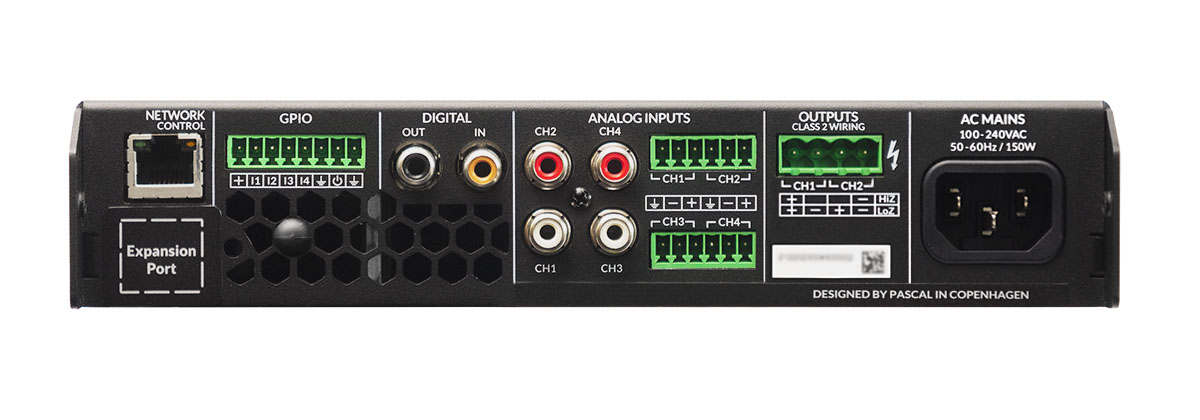 4 indgange. 2 udgange. Fleksibel udgang – 2 kanaler i Lo-Z eller 1 kanal i Hi-Z. Konfigurer dit lydsystem via en intuitiv webbaseret app fra enhver enhed på få minutter (f.eks. en mobiltelefon) og administrer alle indgange, udgange og højttalere i flere zoner.