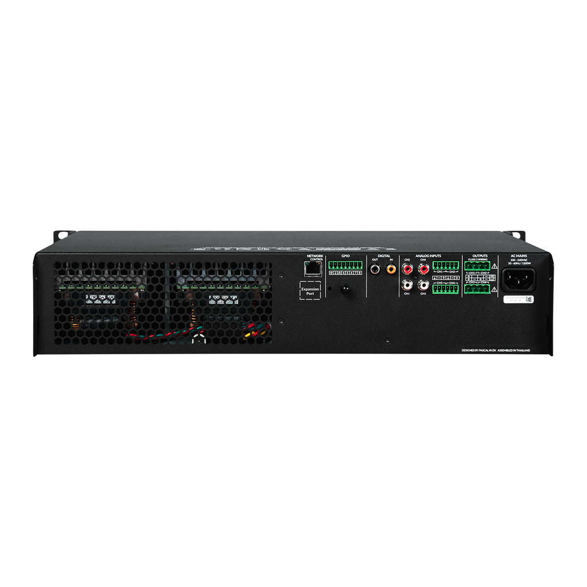 4 indgange. 4 udgange. Fleksibel udgangseffekt – 2000 W. 250W Kan deles automatisk mellem udgange 1 og 2. Og 250W deles mellem kanal 3 & 4. 2 x 1000W i brokoblet tilstand 100V/8ohm. Så du kan opnå den ønskede effekt, når du har brug for det. Kanalerne kan levere både lav og høj impedans (Lo-Z og Hi-Z). Konfigurer dit lydsystem via en intuitiv webbaseret app fra enhver enhed på få minutter (f.eks. en mobiltelefon) og administrer alle indgange, udgange og højttalere i flere zoner.