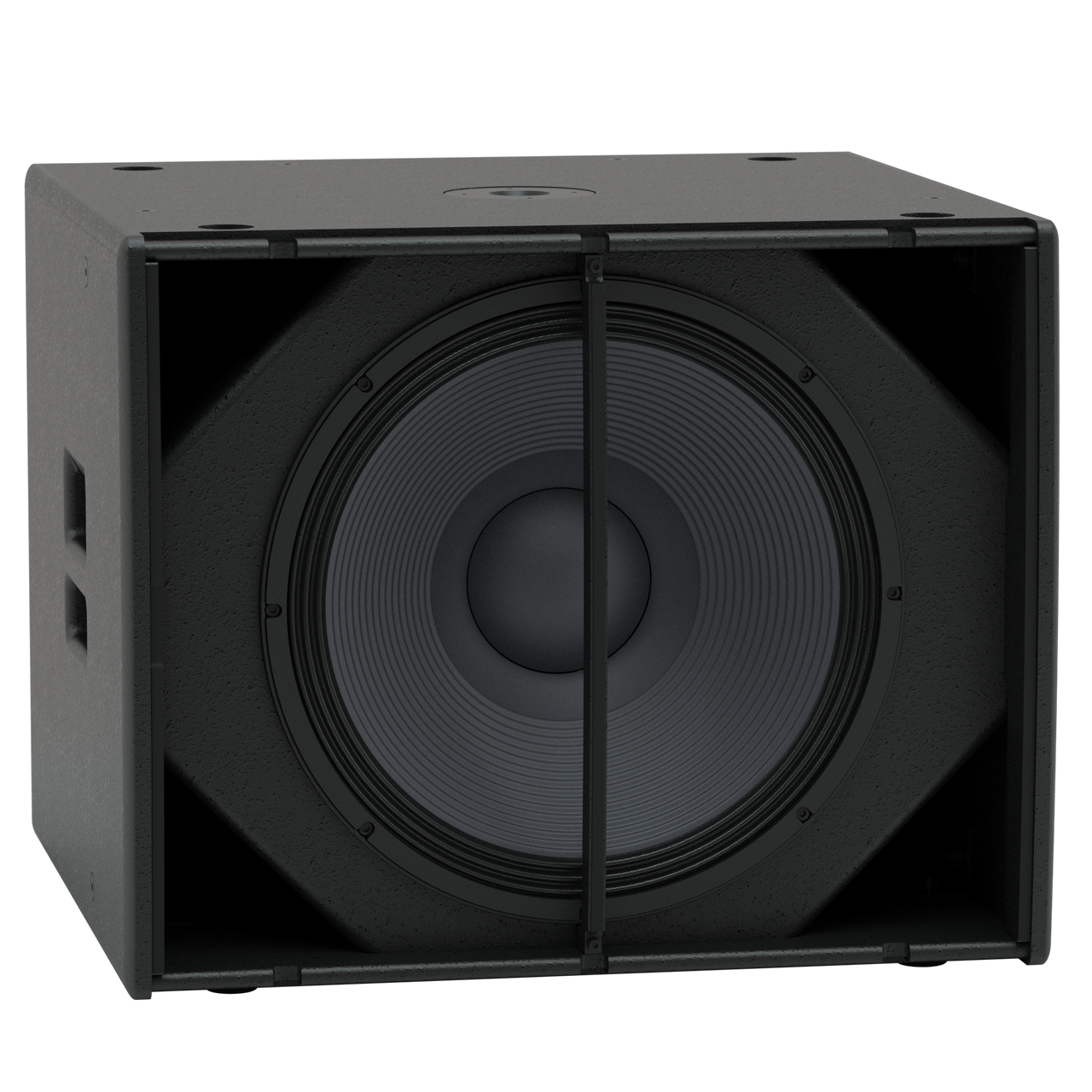 Et perforeret stålgitter beskytter driveren, og kabinettet har en 35 mm. polemount i den øverste overflade og to ergonomiske sidehåndtag.