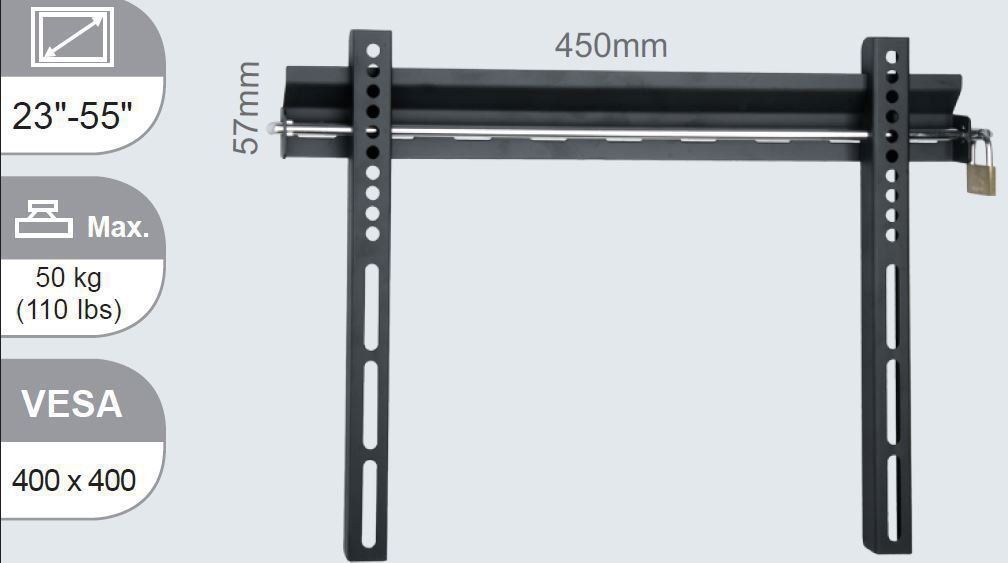 Vivolink stort vægbeslag, flat for 23″ – 55″, fladt. Passer til WESA 400×400 og op til 50kg.. Der er inkluderet en låsearm (hængelås medfølger ikke). Husk at tjekke væggens bære evne.